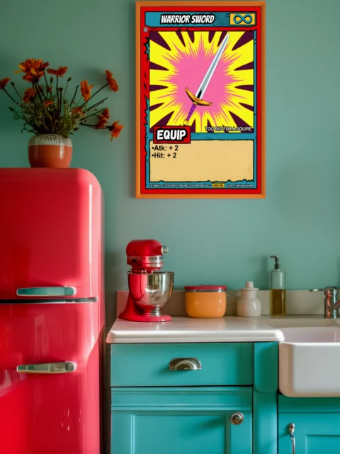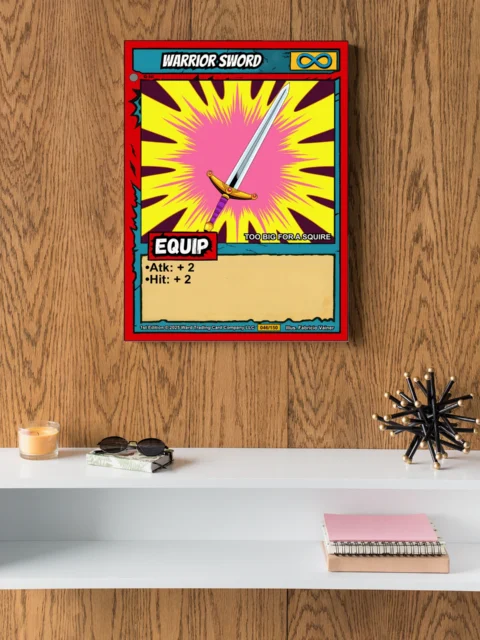 At room scale, the bold linework and high contrast read clearly across the space. This warrior sword trading card canvas print appeals to Ward TCG collectors and tabletop RPG players. The cel-shaded style and heroic tone anchor game room and hobby space walls.