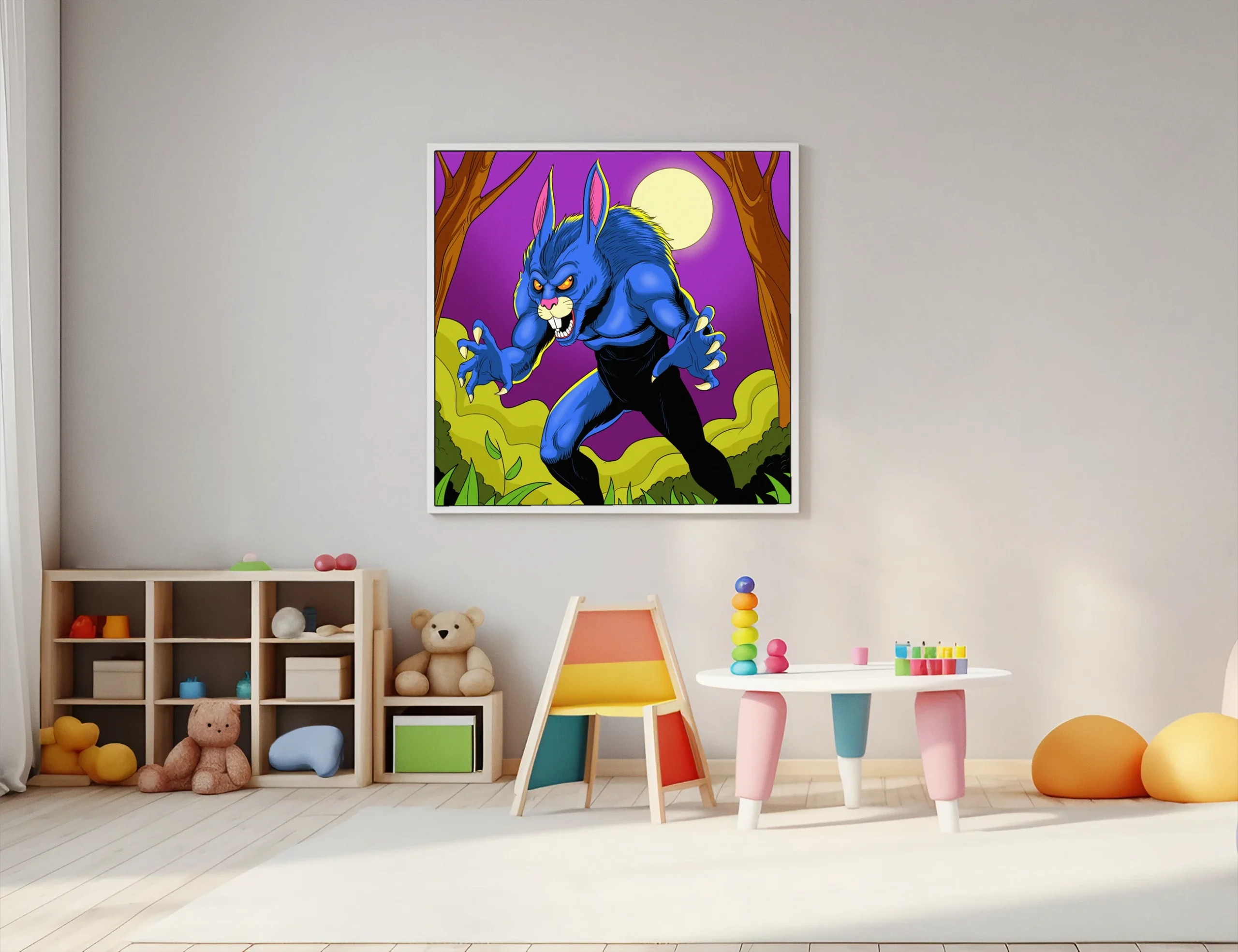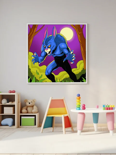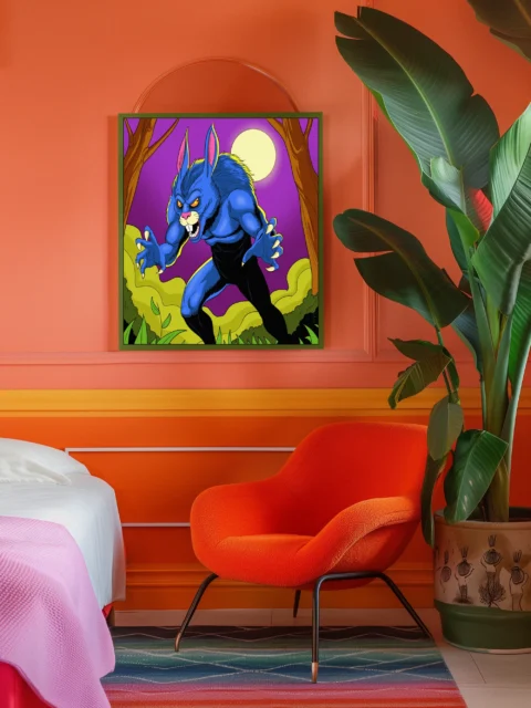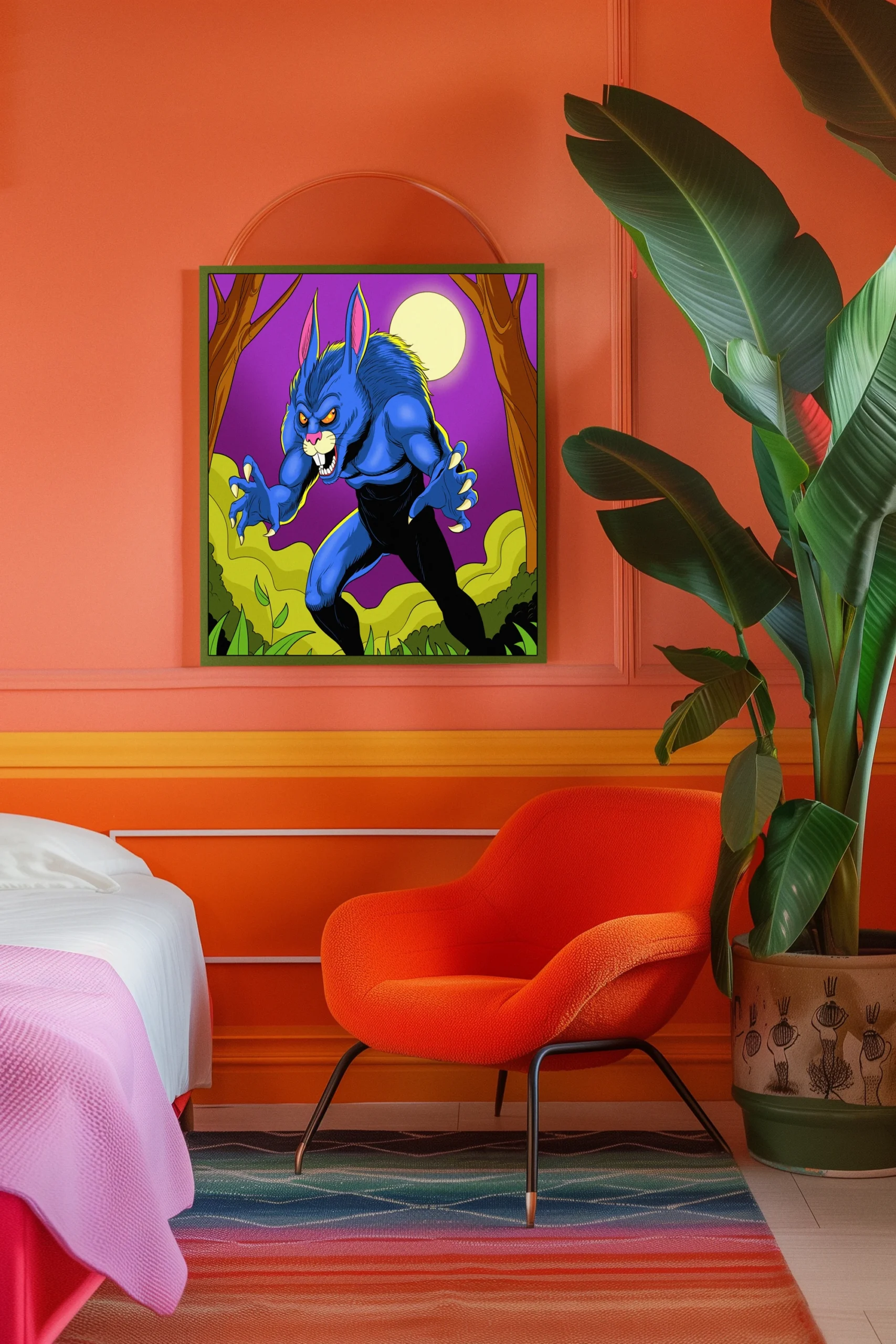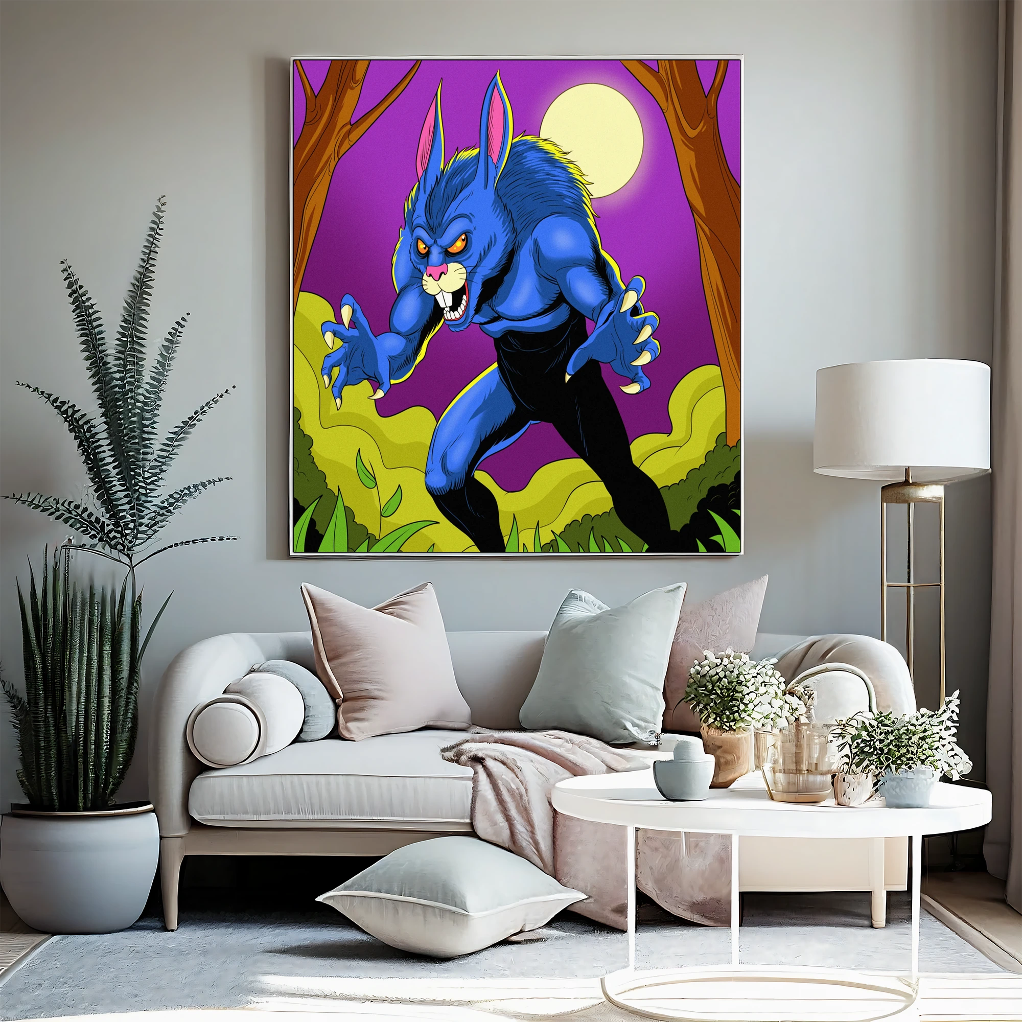 On the wall, the campy horror-comedy tone reads clearer at this scale than miniature formats. Ward TCG collectors and retro creature art enthusiasts both recognize Vainer’s deliberate cartoon menace. This wererabbit art trading card art canvas print delivers pure illustration without distracting card elements.