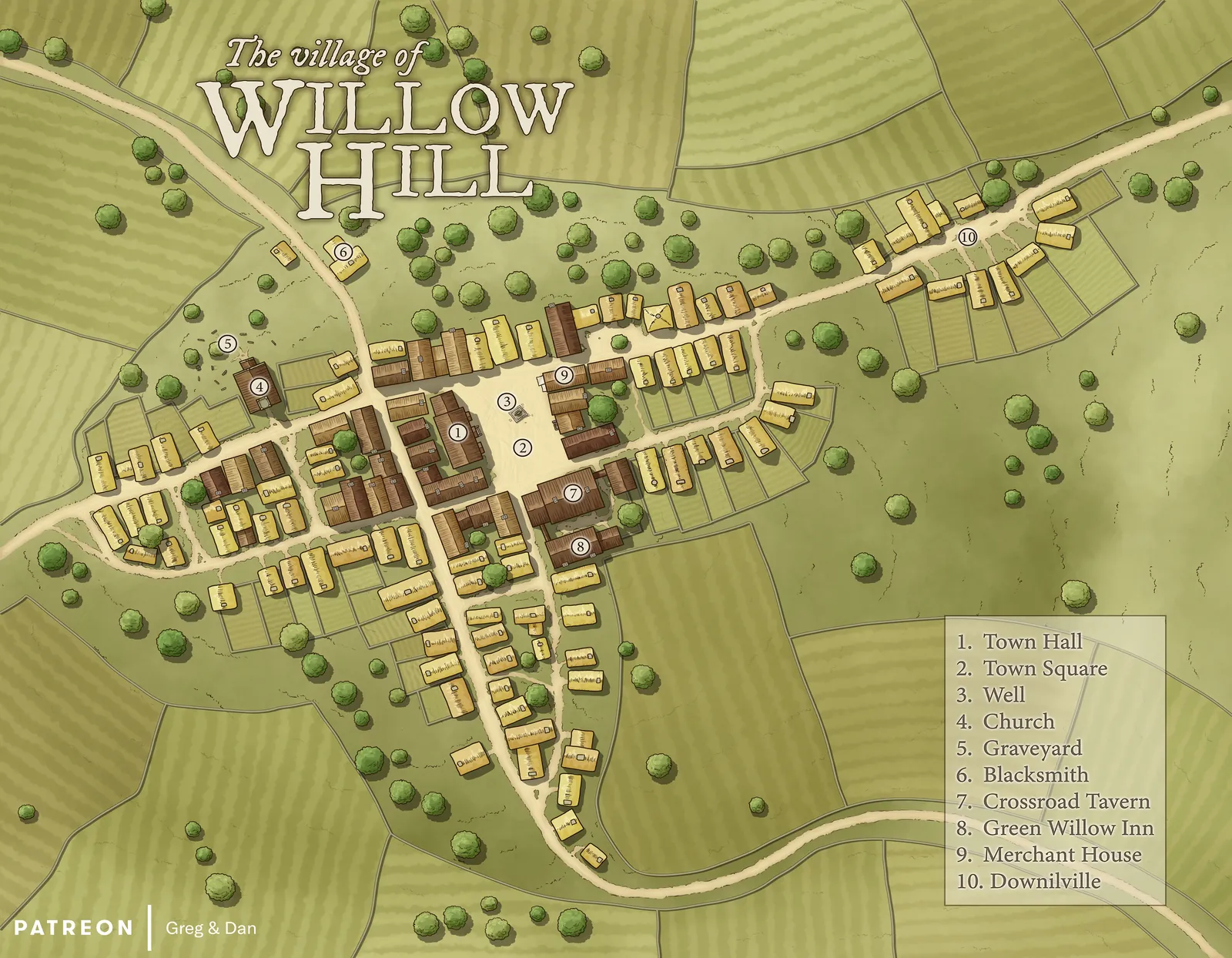 Willow Hill depicts a small rural village centered on trade roads, farmland, and everyday life.