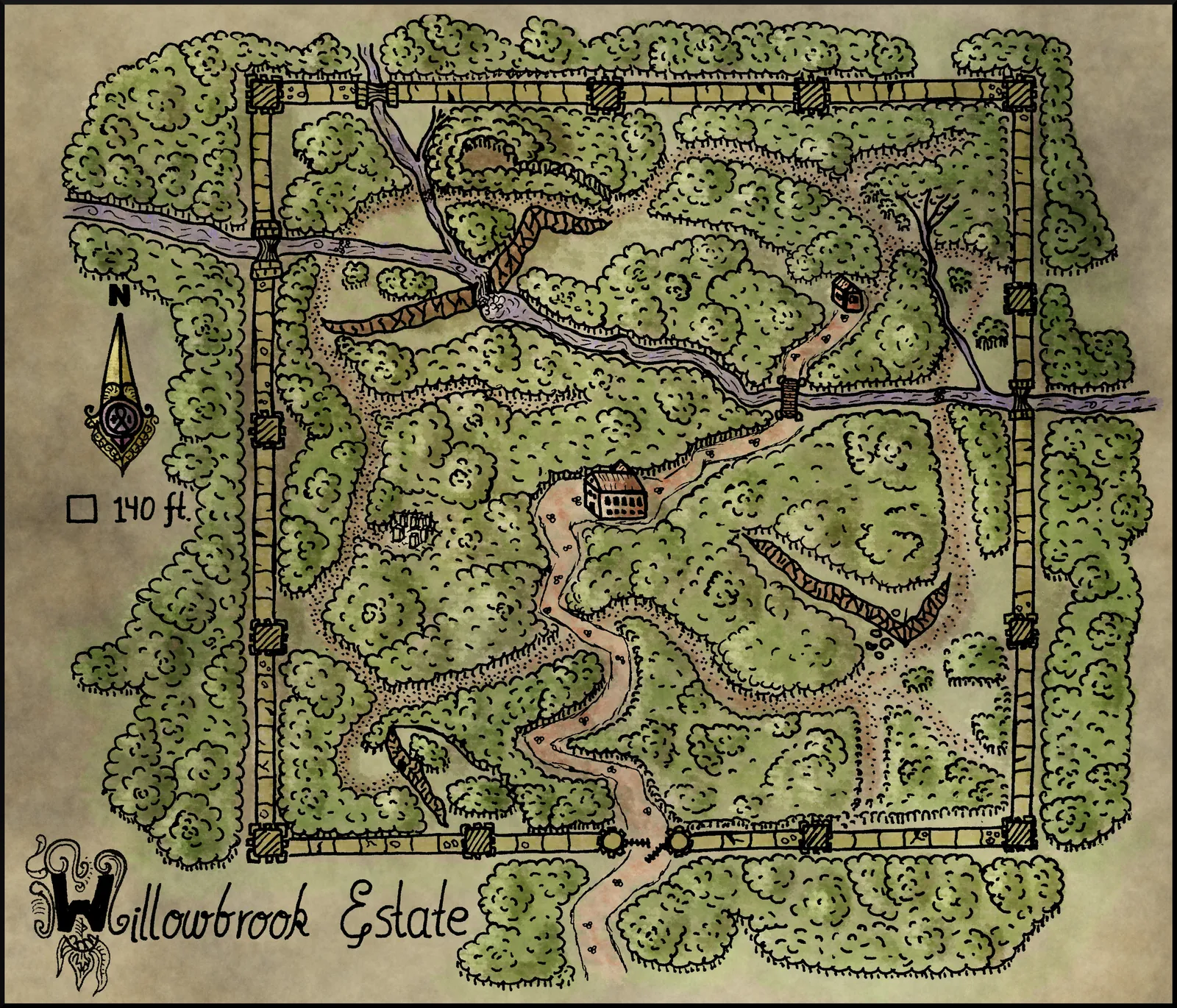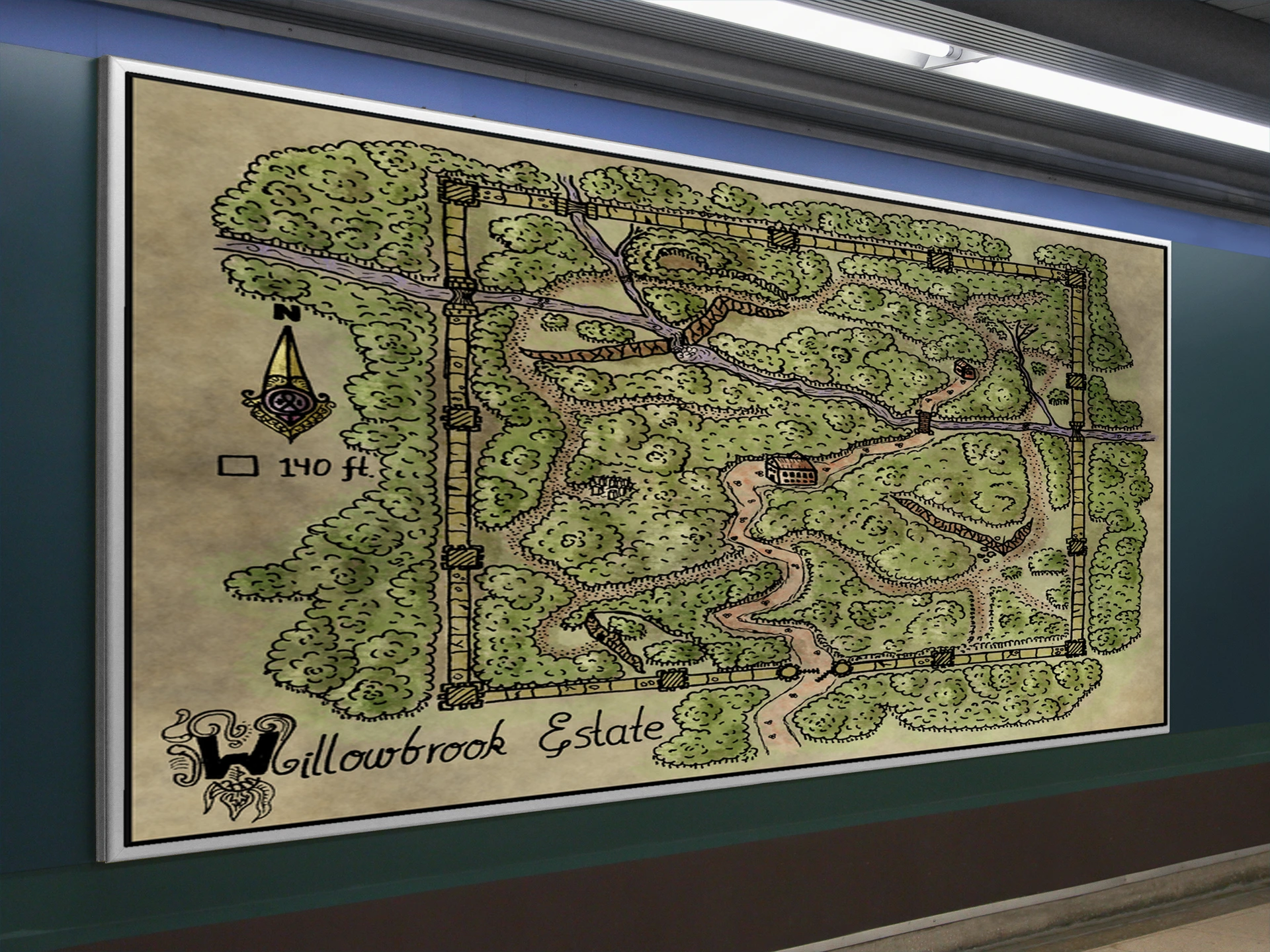 Dense tree cover in light green fills a forested estate. This willowbrook estate fantasy battle map canvas print shows winding paths through woodland terrain. Notably, a heraldic crest and compass rose anchor the parchment-style cartography.