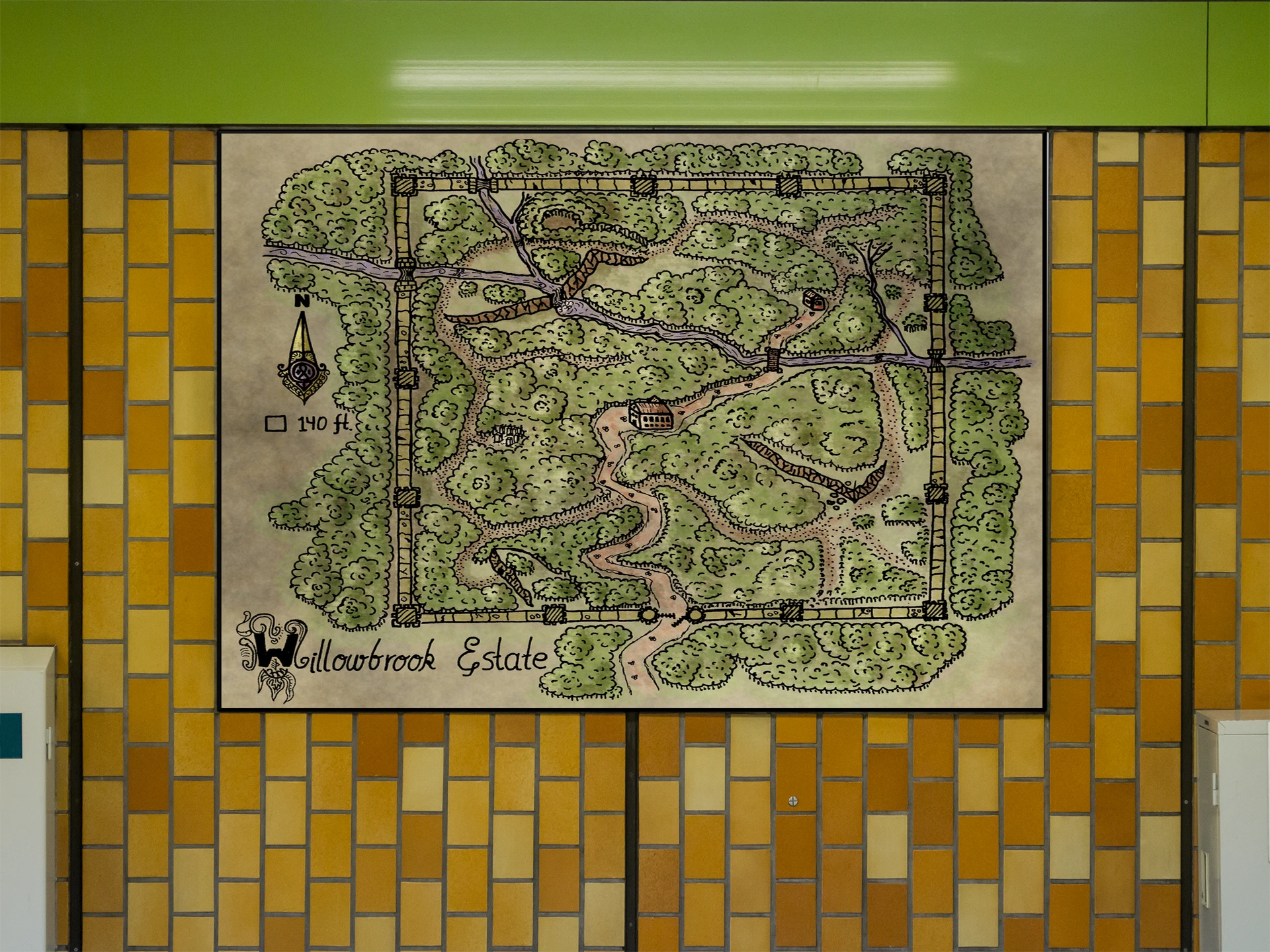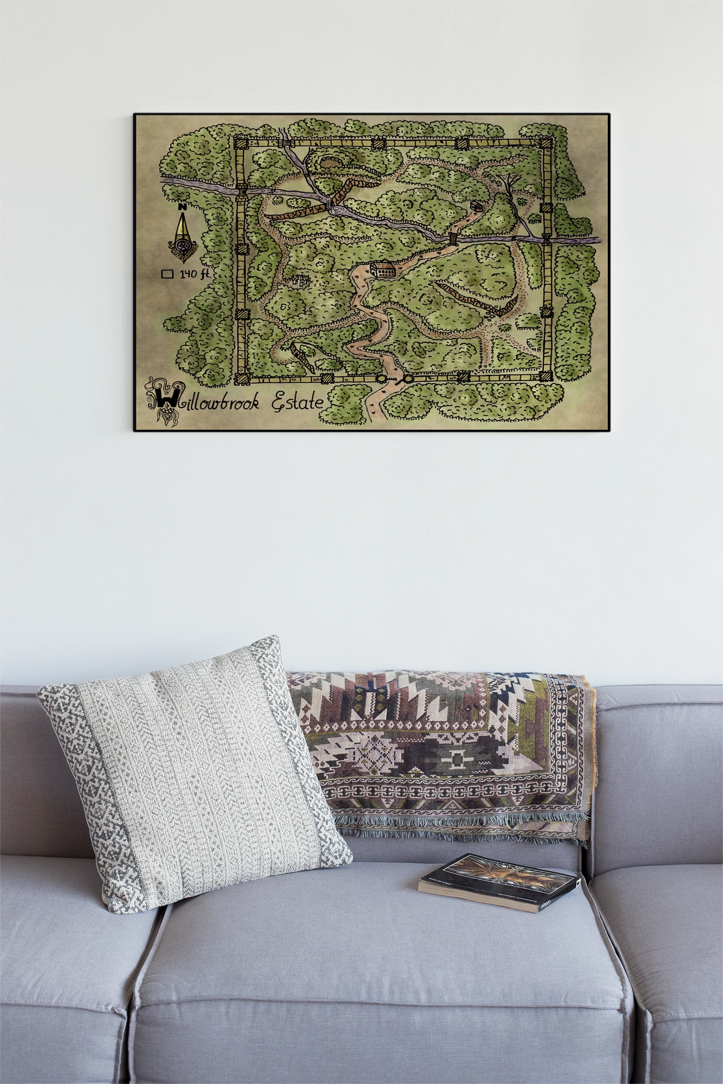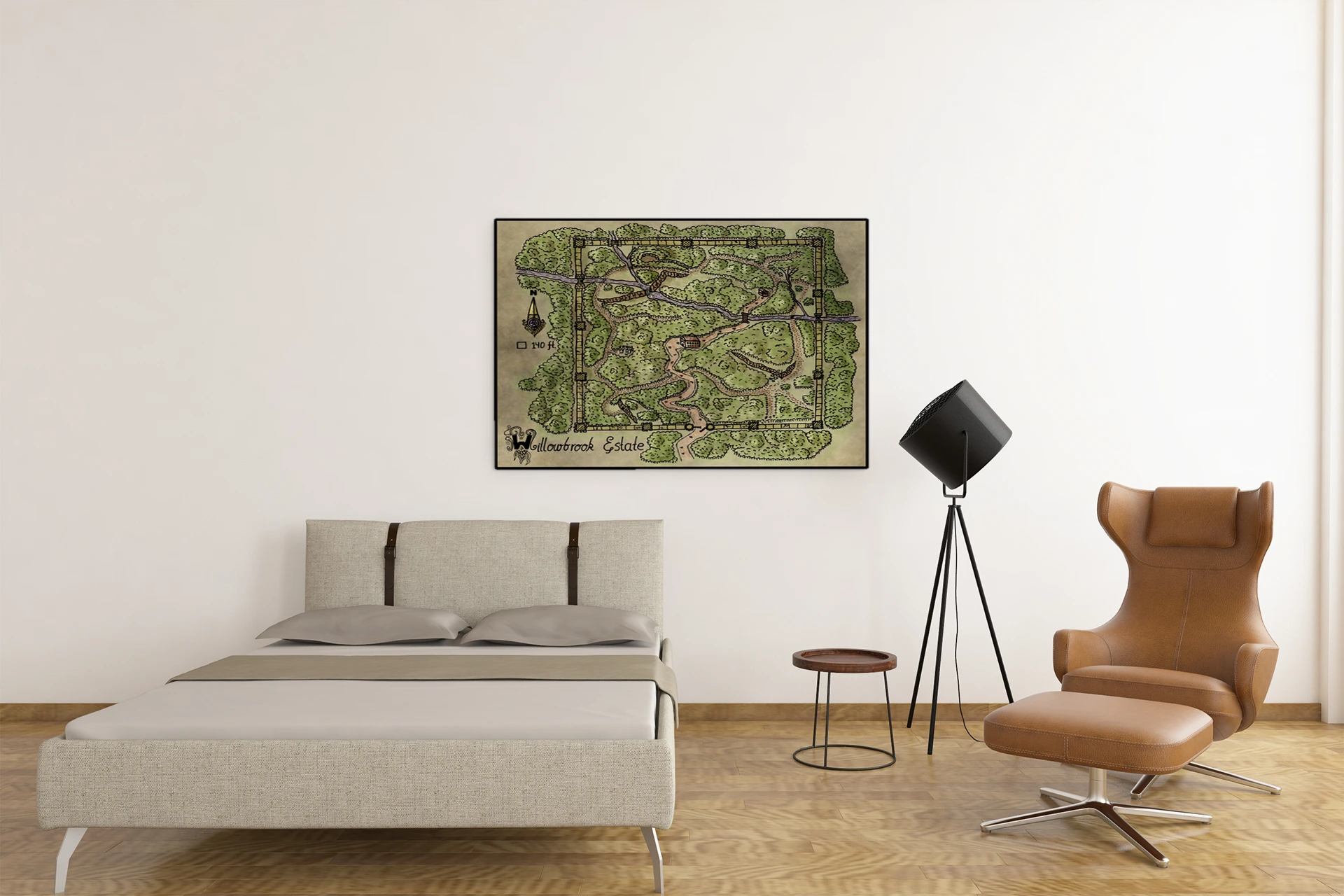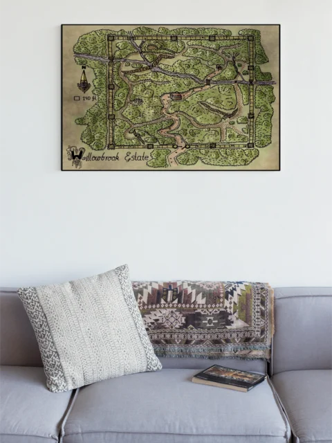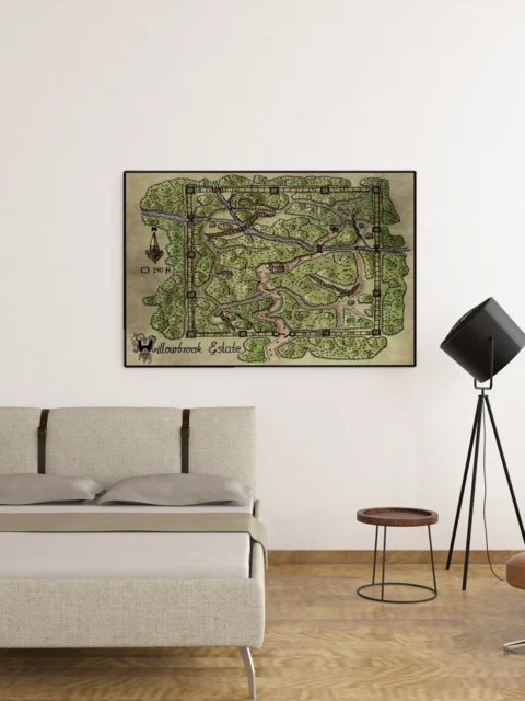 Every DM who runs woodland encounters needs a functional map on the wall. This belongs in game rooms where battle maps double as campaign references between sessions. Players who run druid quests or ranger campaigns particularly value this willowbrook estate fantasy battle map canvas print.