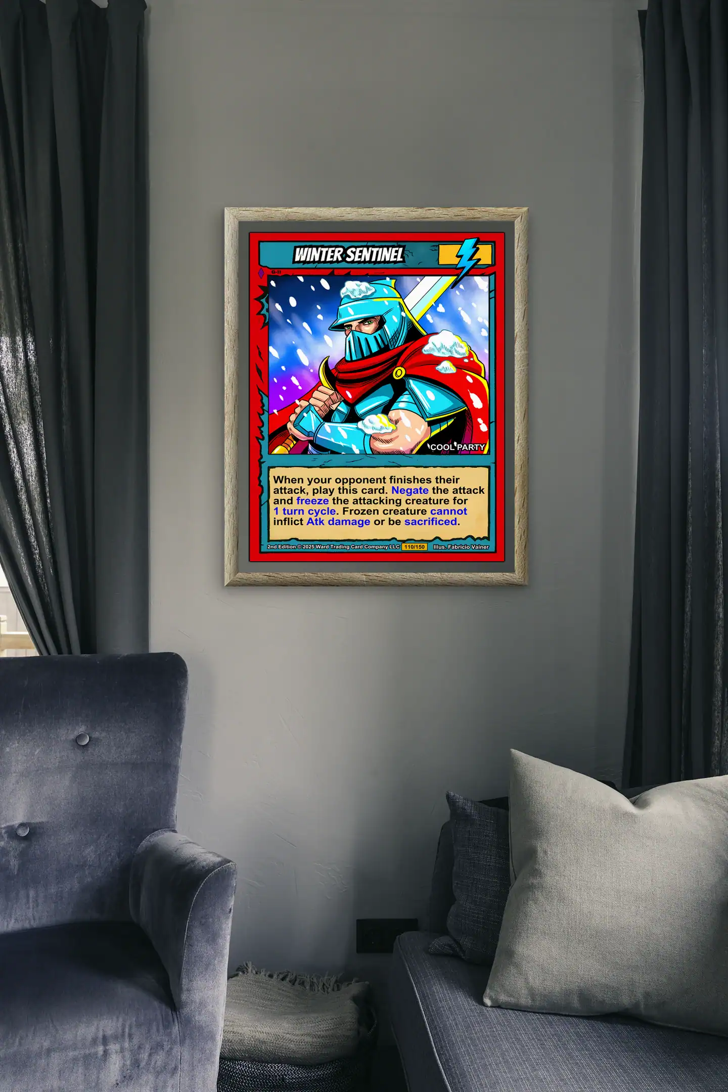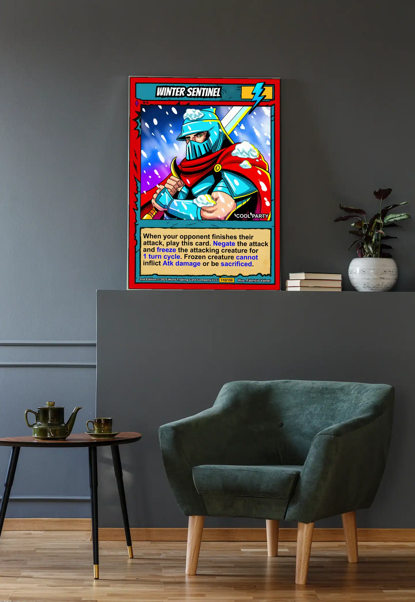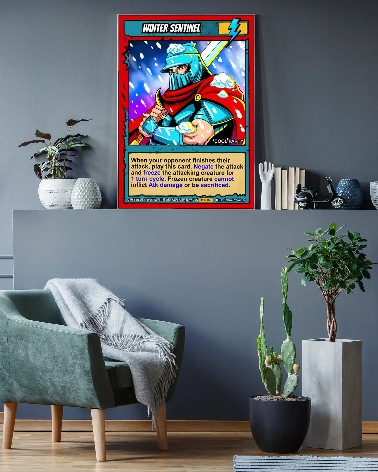 TCG collectors recognize quality card art when they see it. You appreciate Fabricio Vainer’s retro comic aesthetic and Ward TCG’s design philosophy. This winter sentinel trading card canvas print particularly suits collectors above casual players.