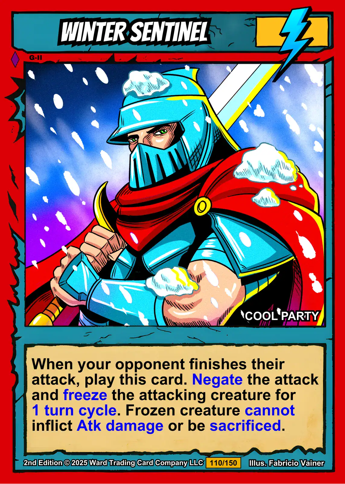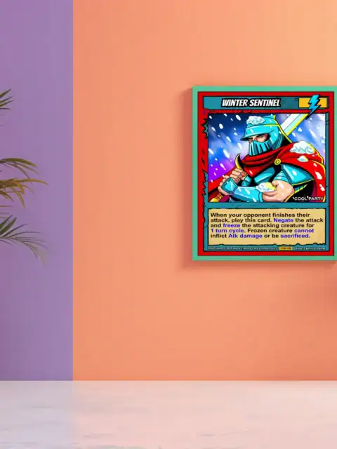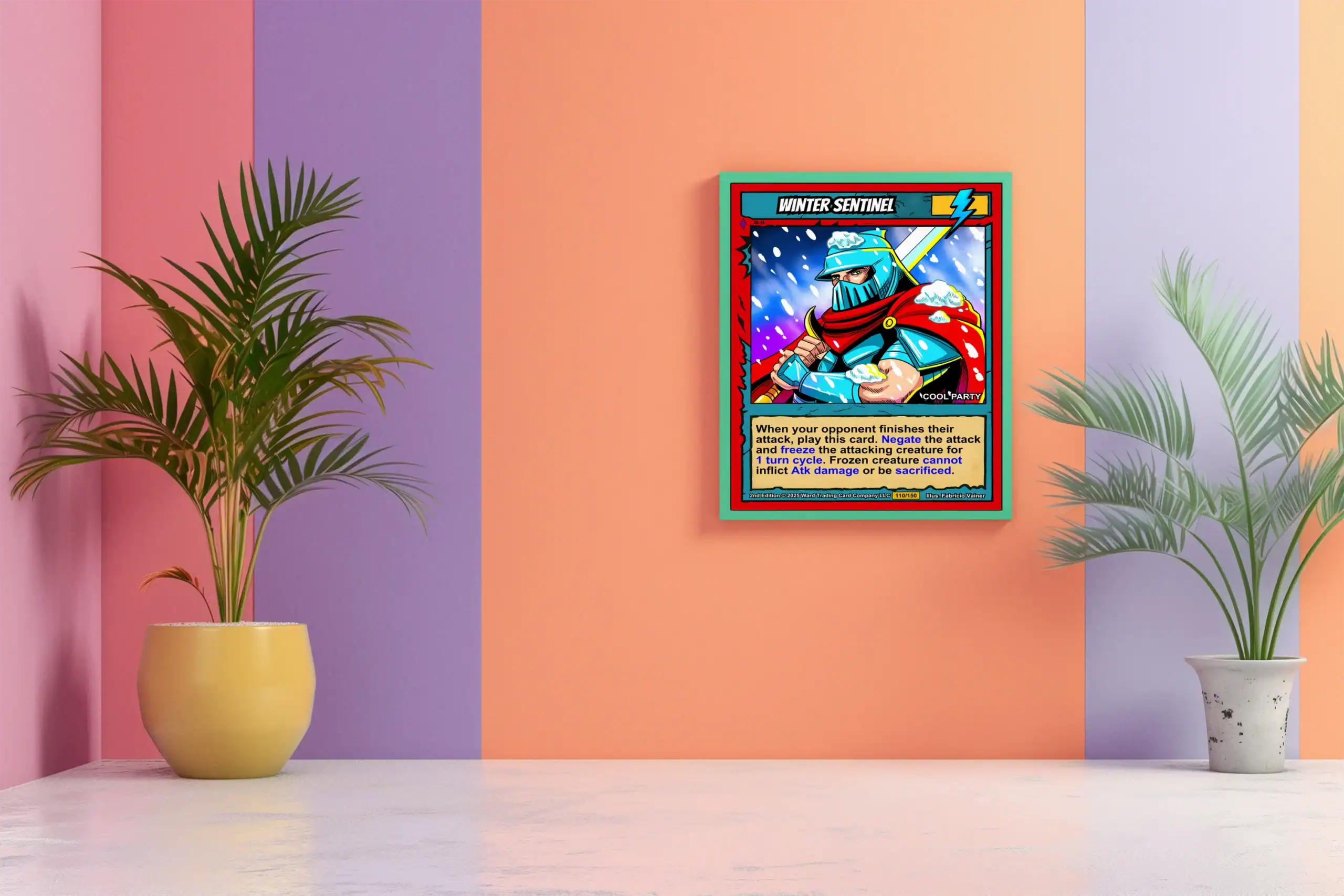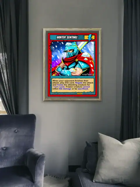 TCG collectors recognize quality card art when they see it. You appreciate Fabricio Vainer’s retro comic aesthetic and Ward TCG’s design philosophy. This winter sentinel trading card canvas print particularly suits collectors above casual players.