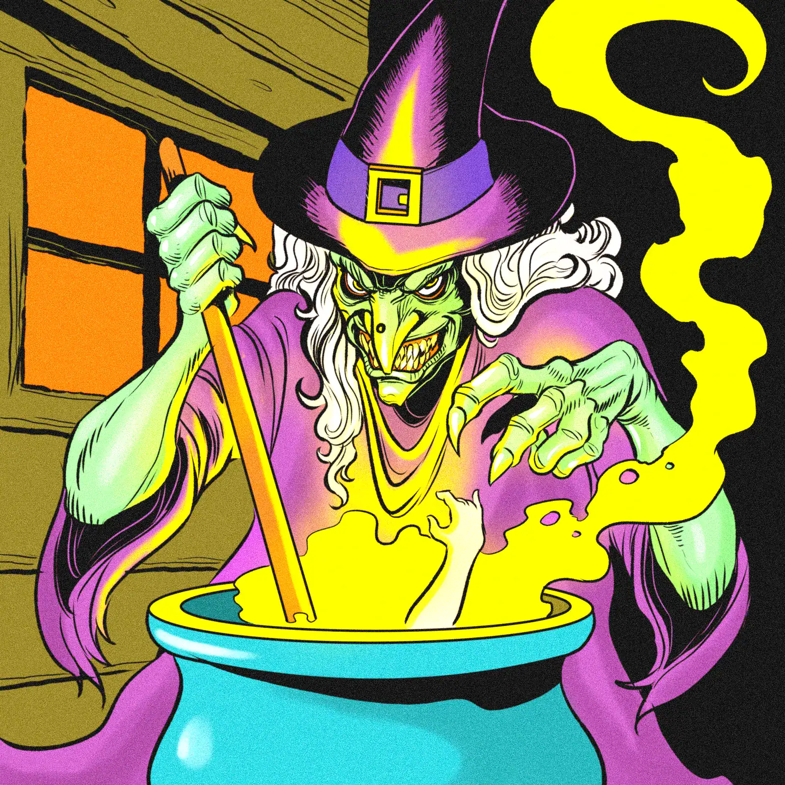 Equally, the purple robes and pointed hat with yellow buckle define her classic witch silhouette. Meanwhile, orange window light contrasts against wooden planks and bold black shadows. The cel-shaded comic style uses heavy outlines and flat color fills.