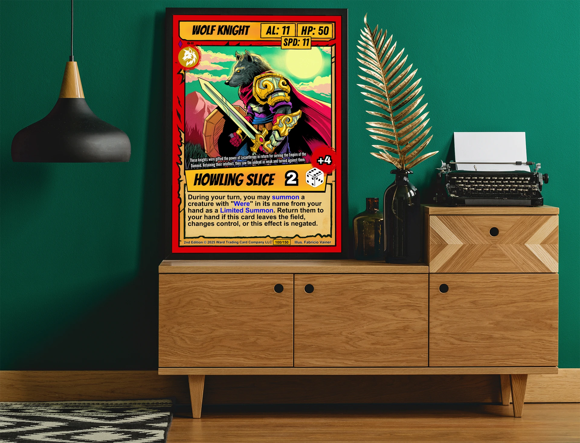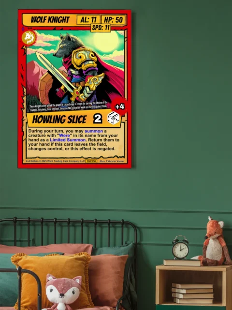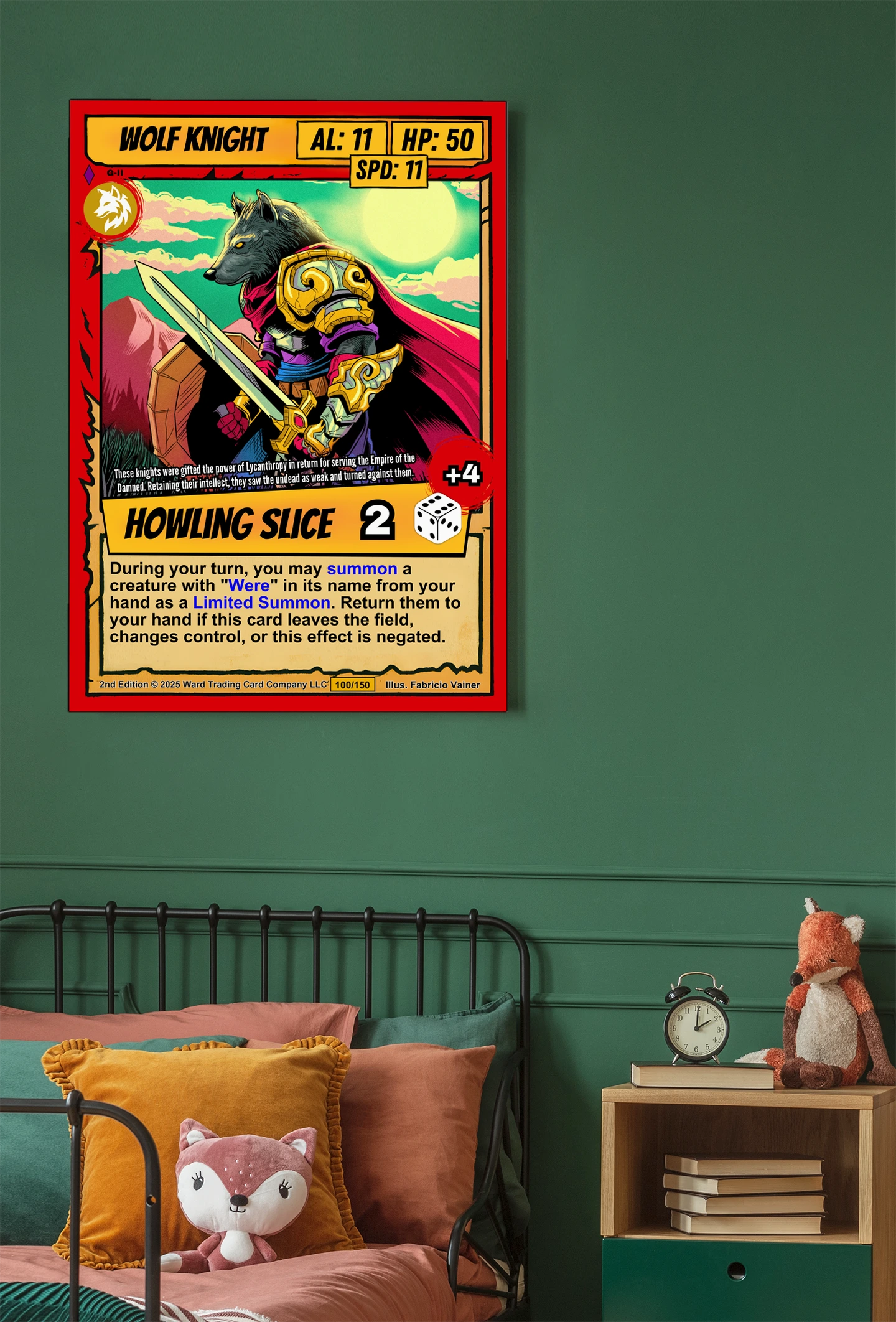 The bold comic book linework and cel-shaded coloring read clearly from across the room. This piece speaks to Ward TCG collectors who want their wolf knight trading card canvas print at wall scale. Specifically, the saturated palette and heavy black outlines hold visual weight in any viewing context.