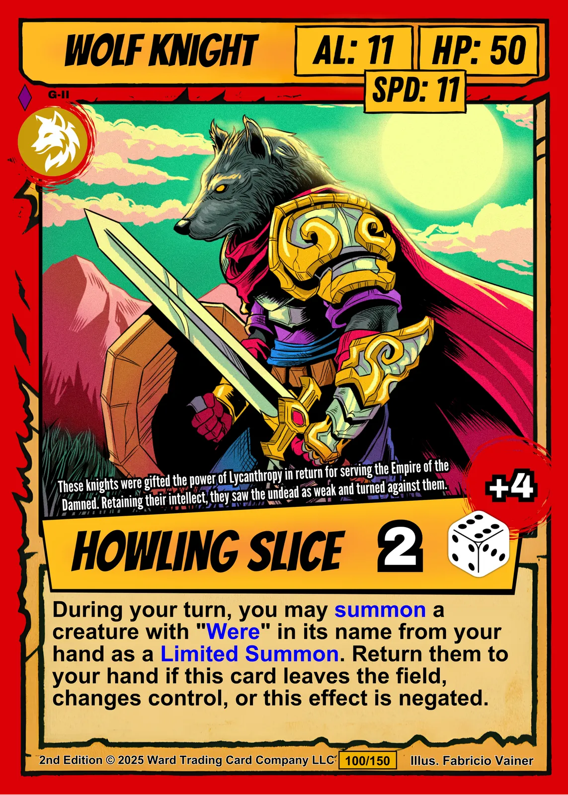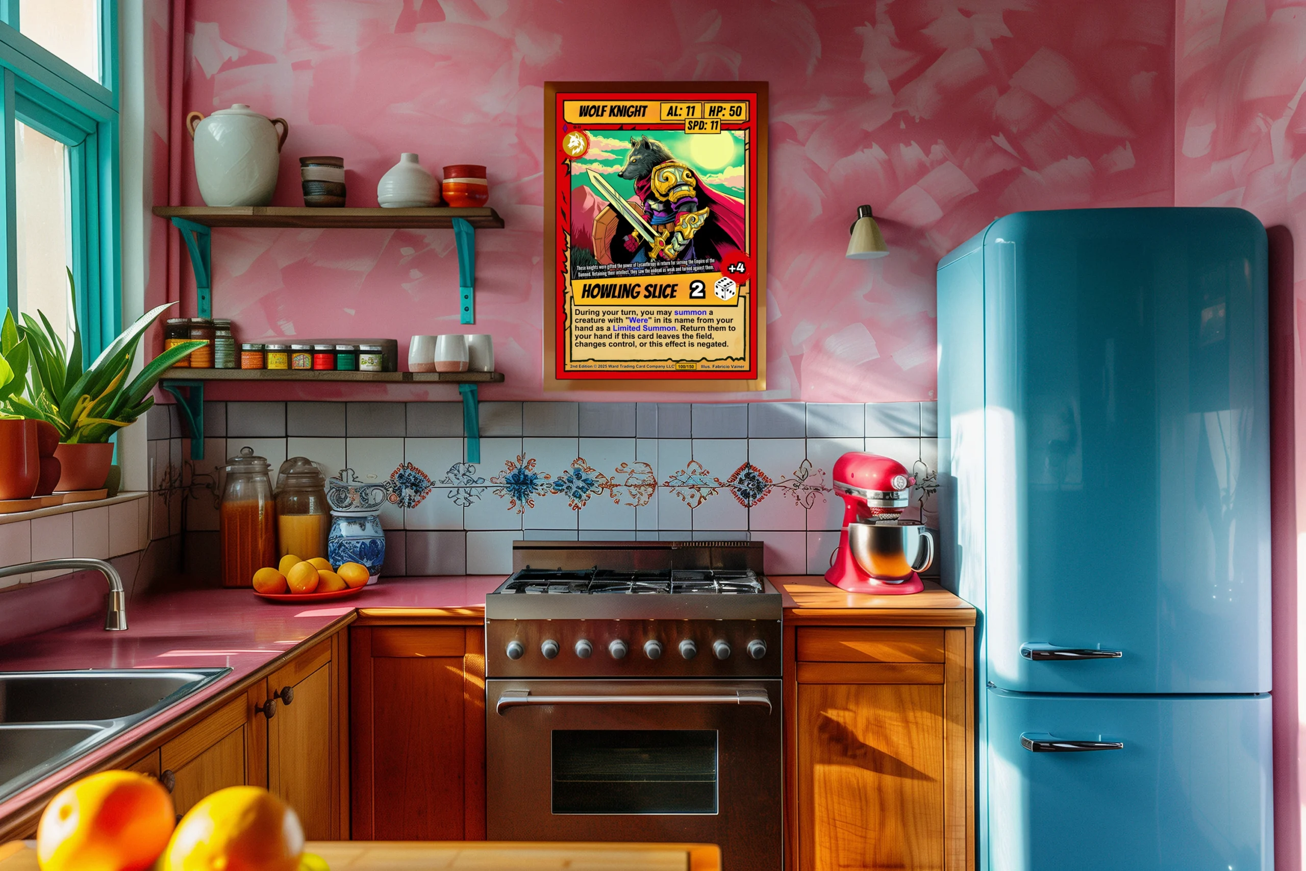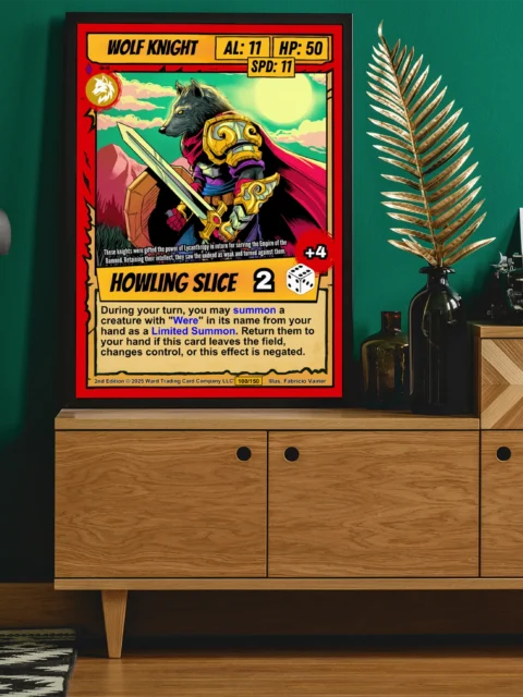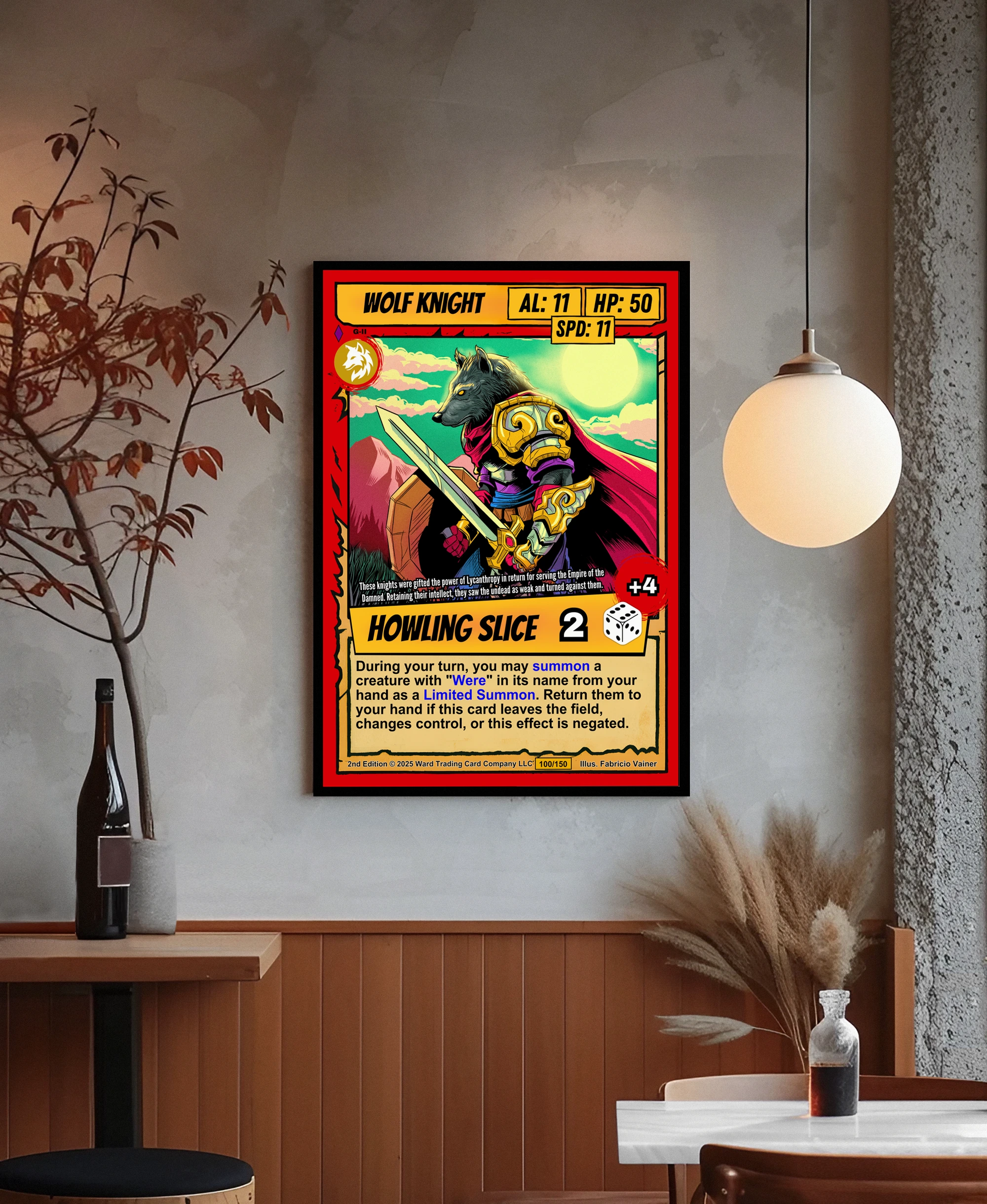 The bold comic book linework and cel-shaded coloring read clearly from across the room. This piece speaks to Ward TCG collectors who want their wolf knight trading card canvas print at wall scale. Specifically, the saturated palette and heavy black outlines hold visual weight in any viewing context.