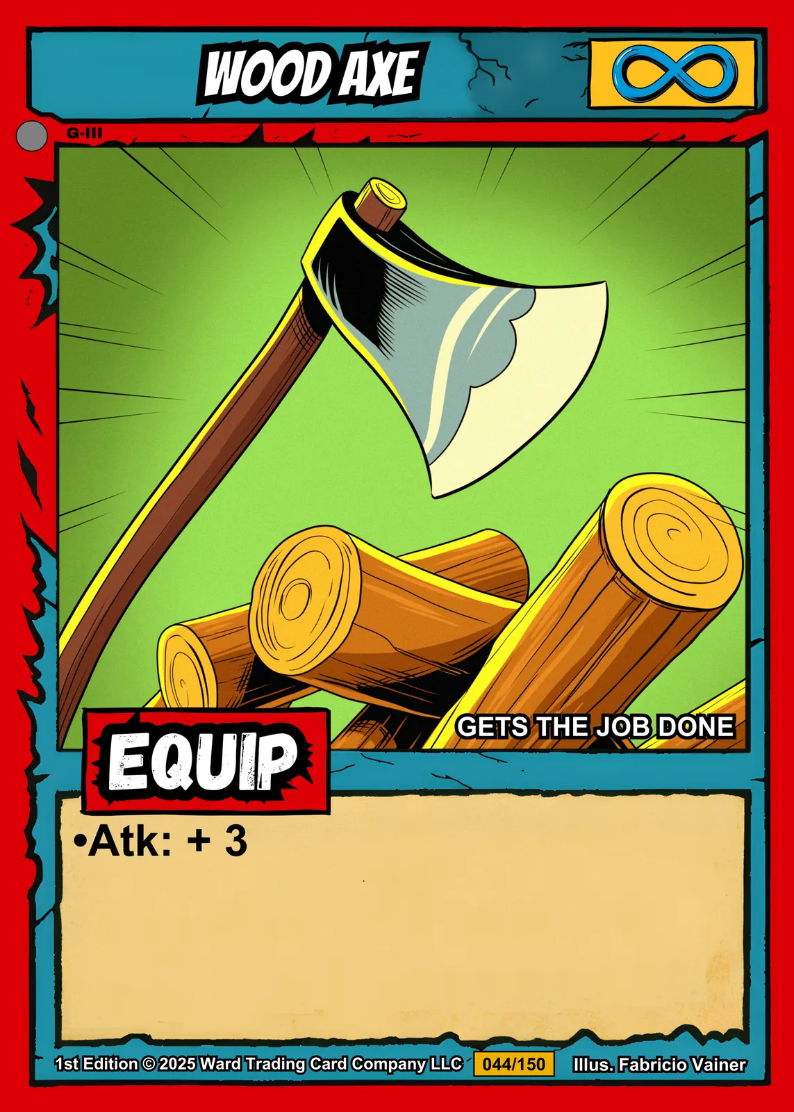 Additionally, the bright red border frames a blue title banner reading ‘WOOD AXE’ in stylized yellow letters. An orange infinity symbol sits in the upper right corner. The stat box shows Atk: +3 alongside a red ‘EQUIP’ label.