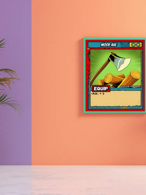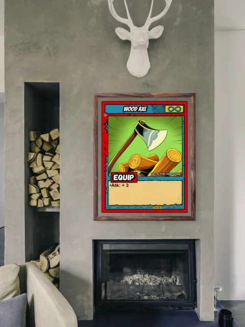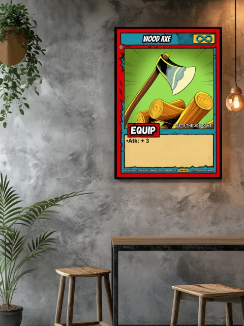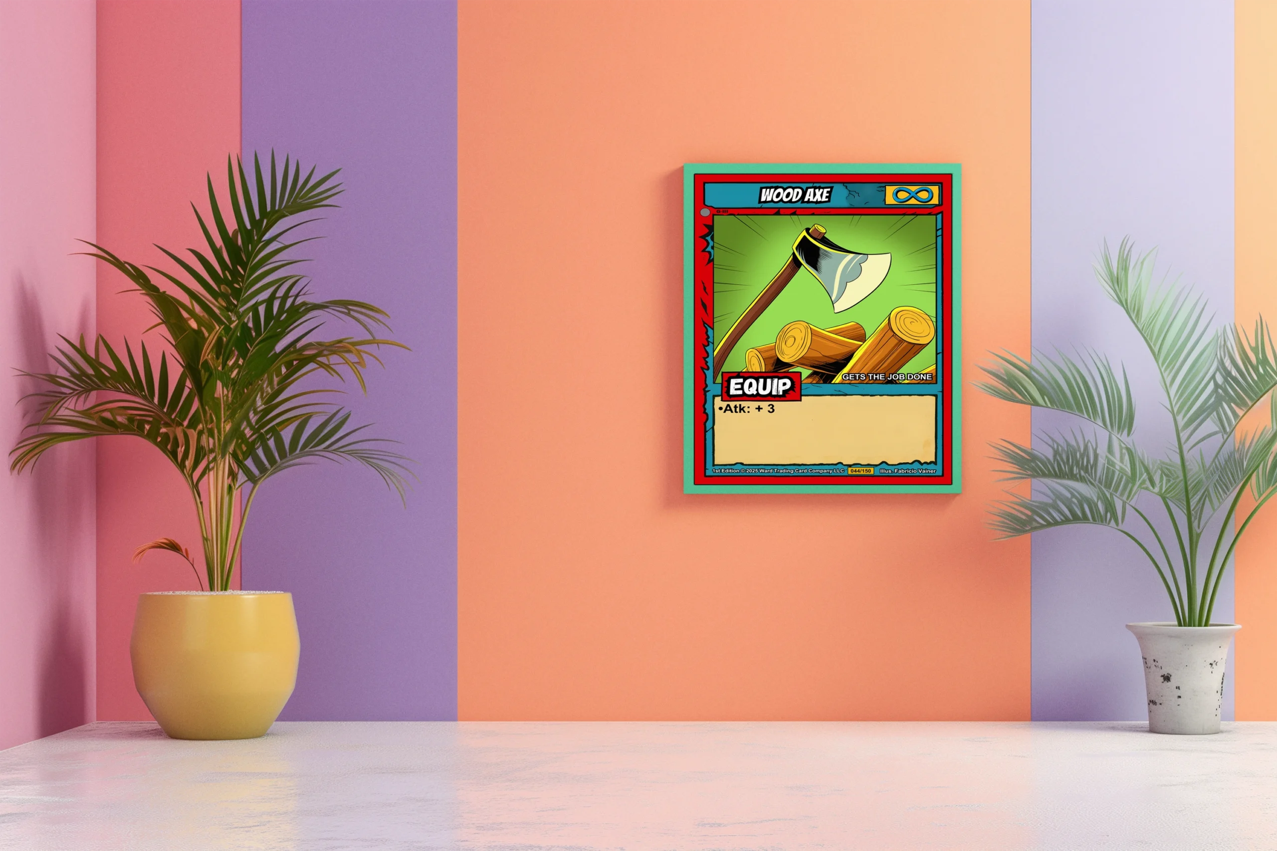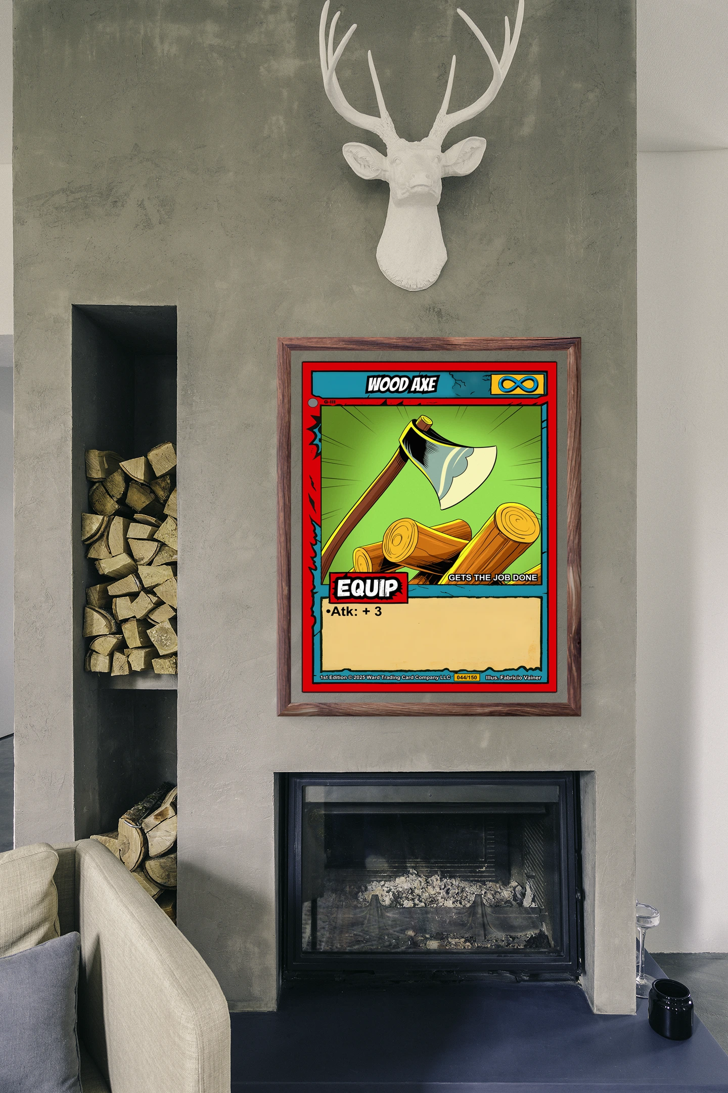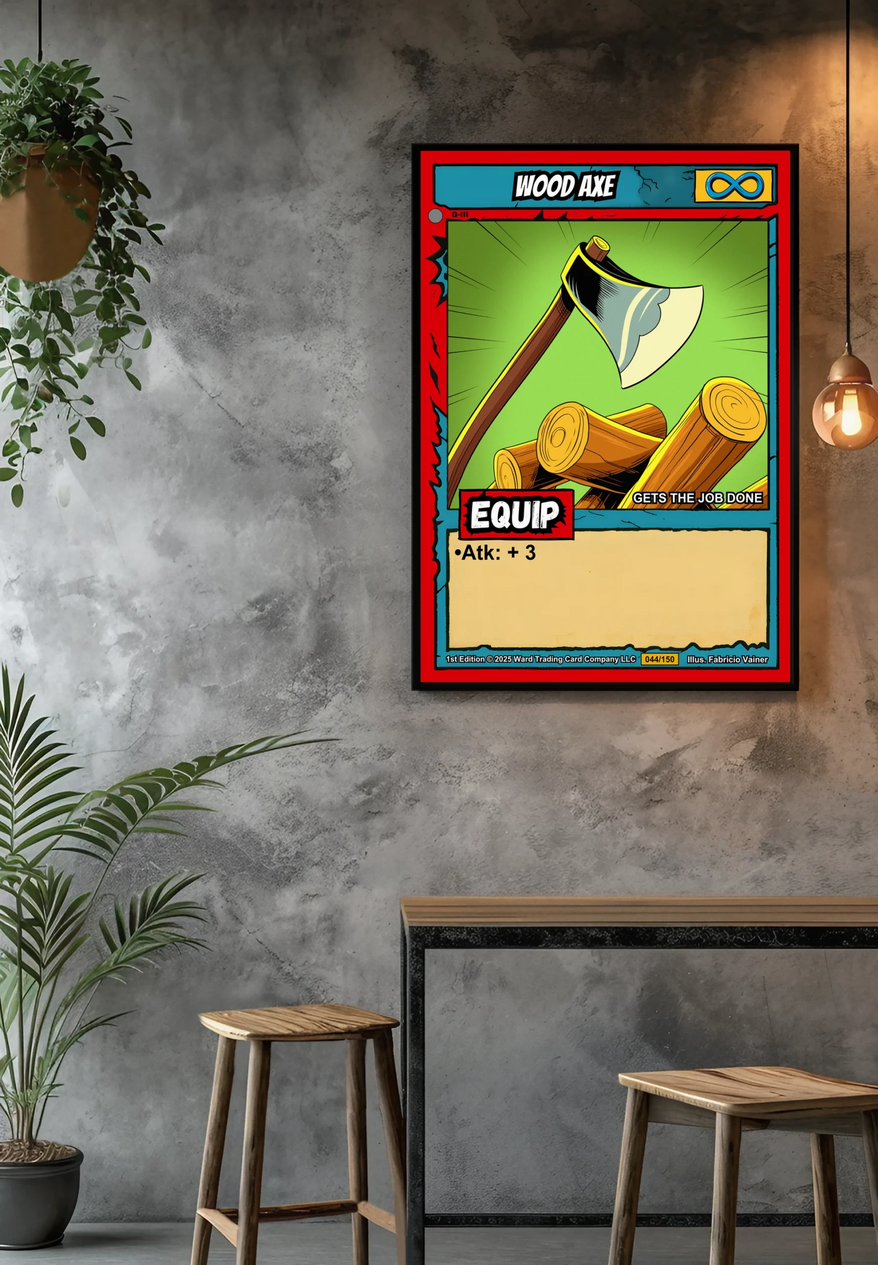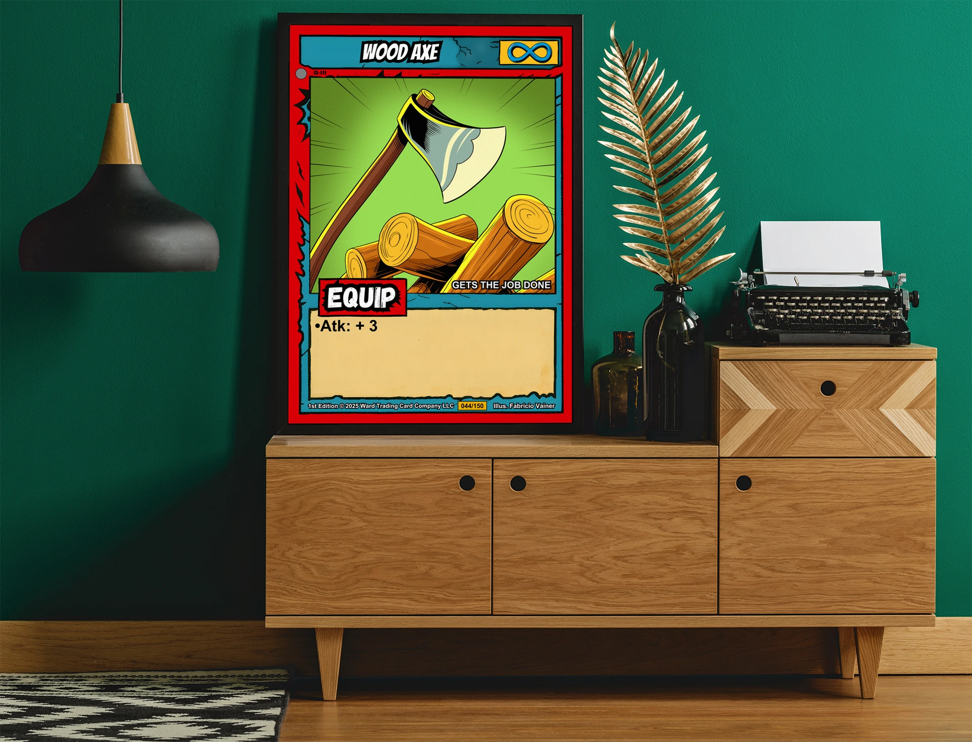 The radial green background and speed lines create energy at room scale. Collectors hunting equipment cards recognize this wood axe trading card canvas print immediately. The parchment text area and distressed border texture deliver authentic card feel.