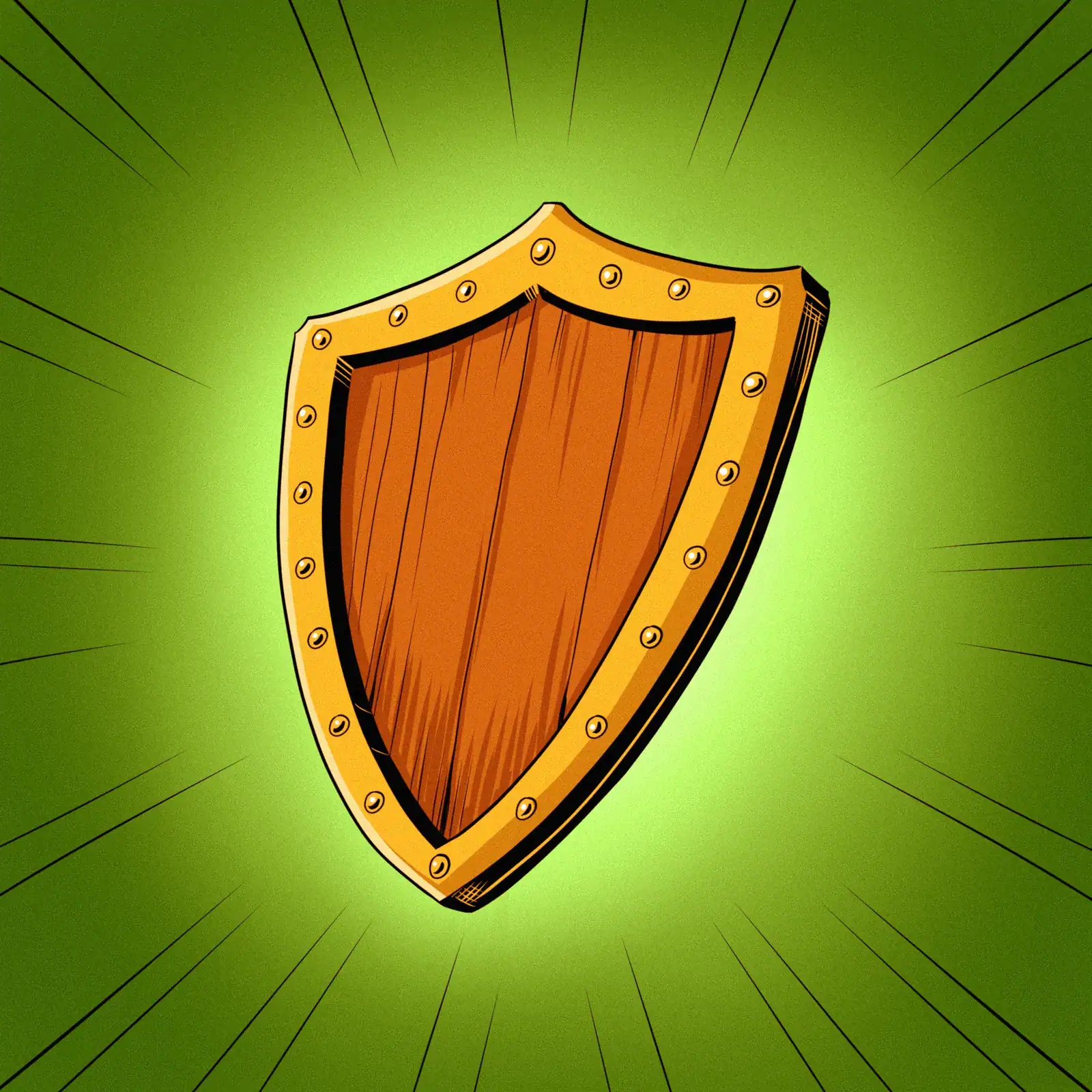 In particular, radiating action lines burst from behind the shield in classic comic style. The bright green background contrasts sharply with the orange-brown wood tones. Moreover, bold black outlines define every edge with cel-shaded precision.