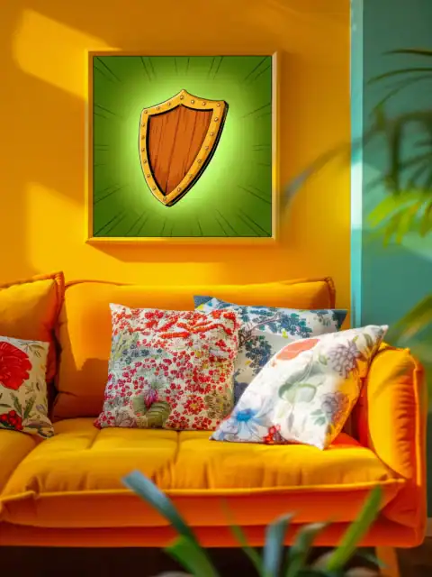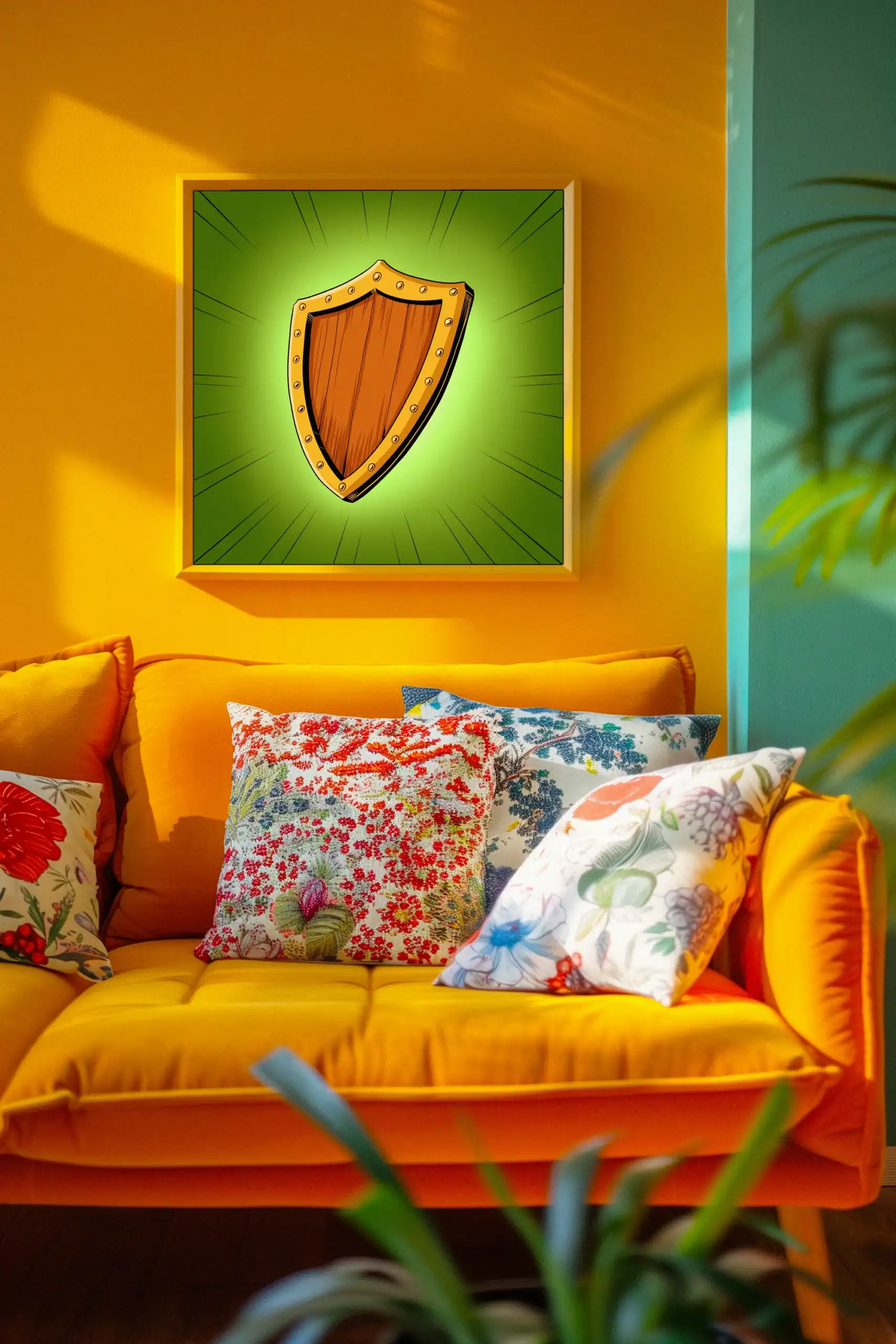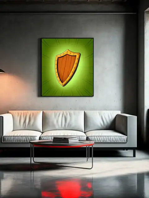 A wooden shield with golden metal rim commands the frame against vibrant green. This wood shield art trading card canvas print showcases Fabricio Vainer’s retro comic illustration. Notably, round rivets punctuate the border while wood grain textures the face.