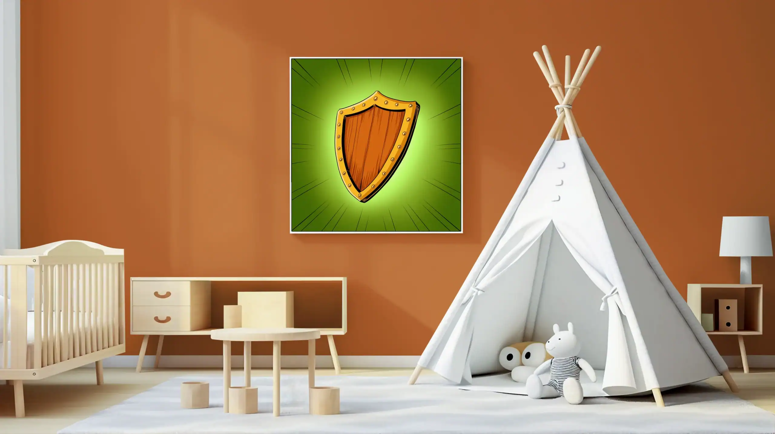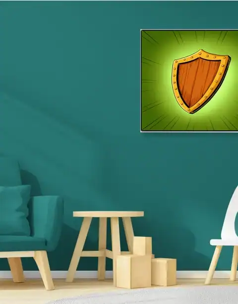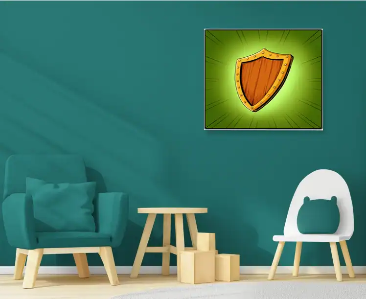 Study spaces where worldbuilding happens gain focus from this heroic shield centerpiece. Additionally, the bold comic styling energizes creative sessions and campaign development.