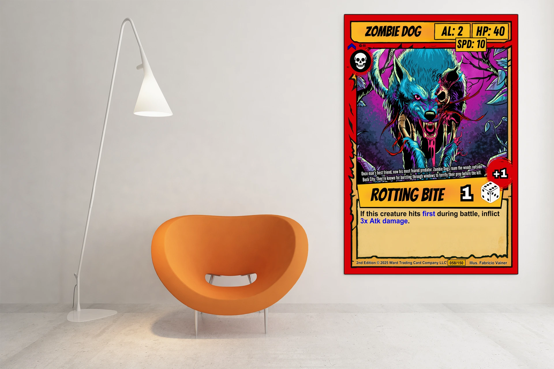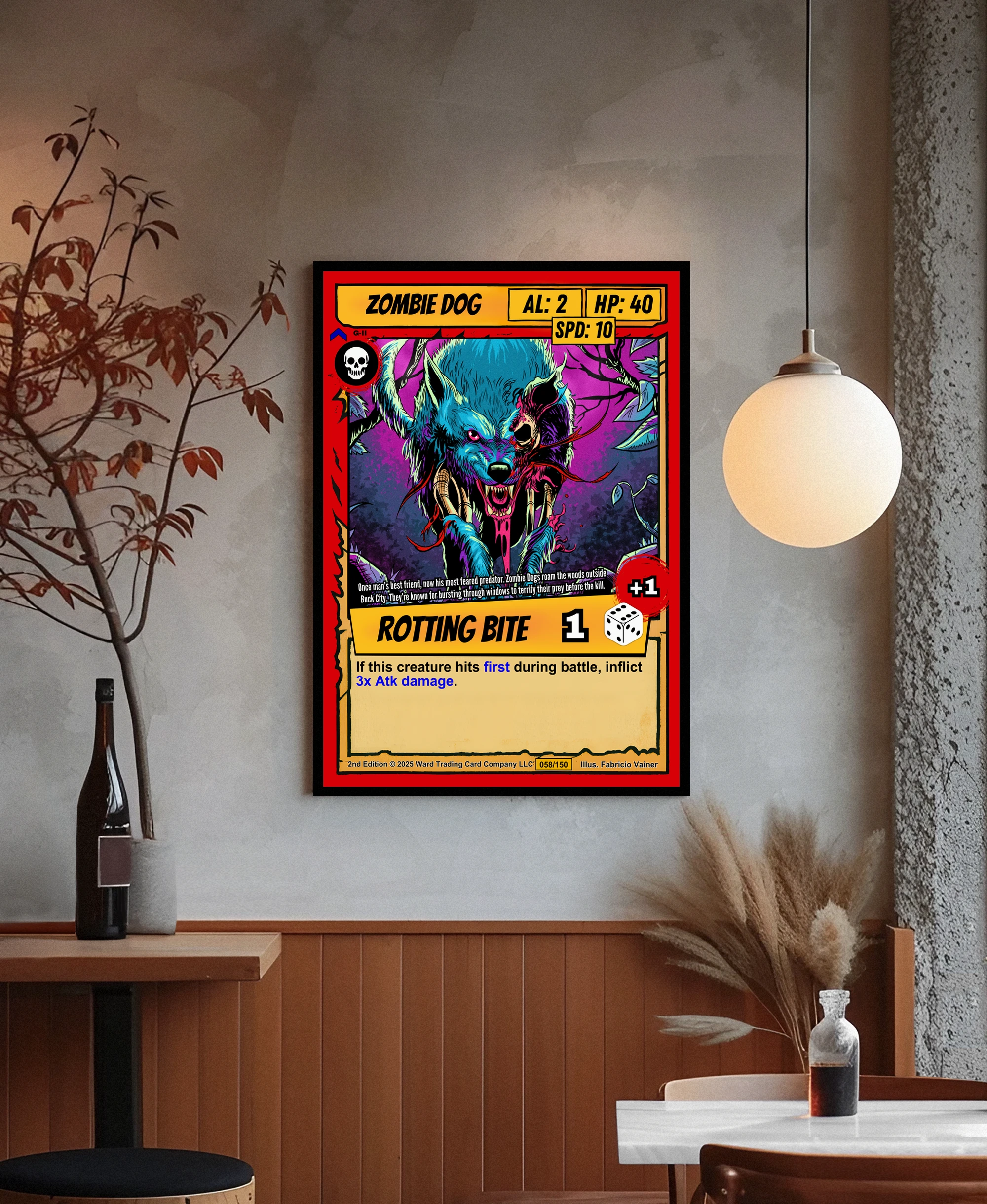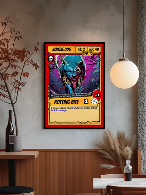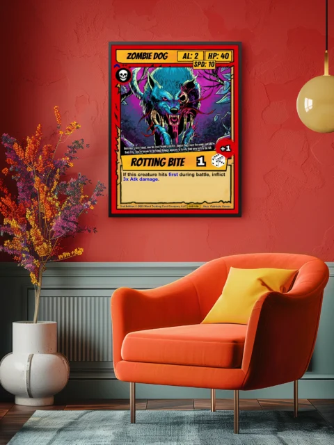The purple and magenta background with twisted branches creates depth behind the creature. Collectors of horror-themed trading card art will recognize the second edition Ward TCG design language. This zombie dog trading card canvas print captures the ROTTING BITE ability text and dice icon in yellow banners.