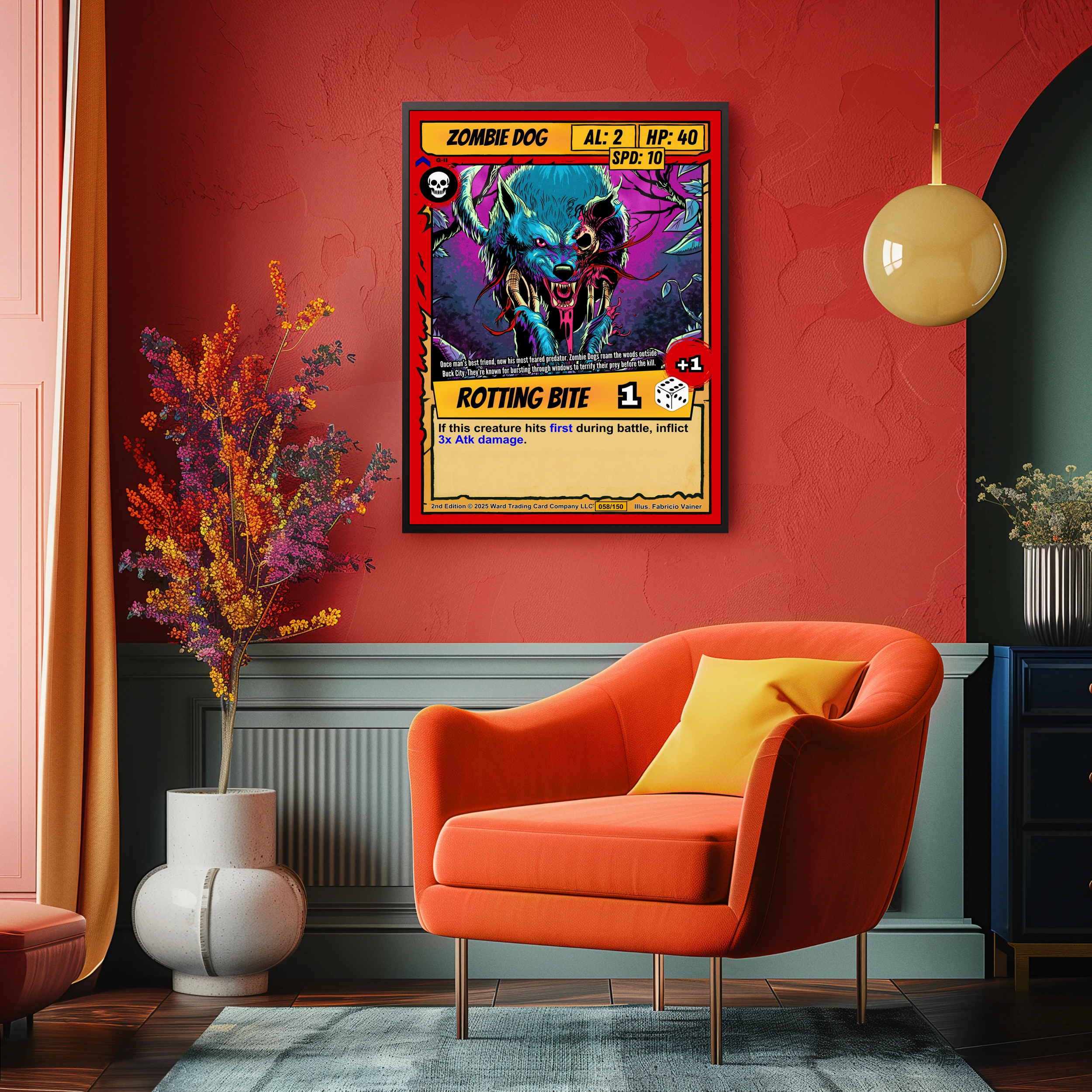 This piece works well in game rooms where bold creature art sets the tone. Additionally, it pairs naturally with other Ward TCG horror-class character prints.