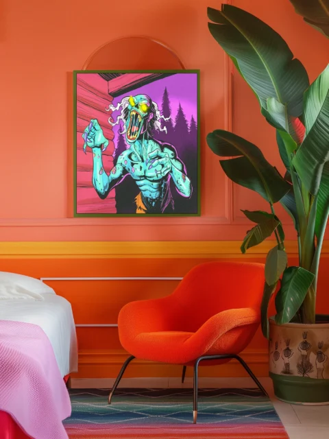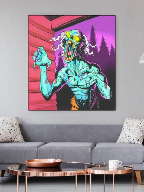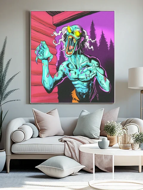 Game rooms and collector walls gain a horror-comic centerpiece that celebrates undead creature design with unapologetic intensity. Additionally, the piece works particularly well in creative studios where campy monster art fuels imaginative energy.